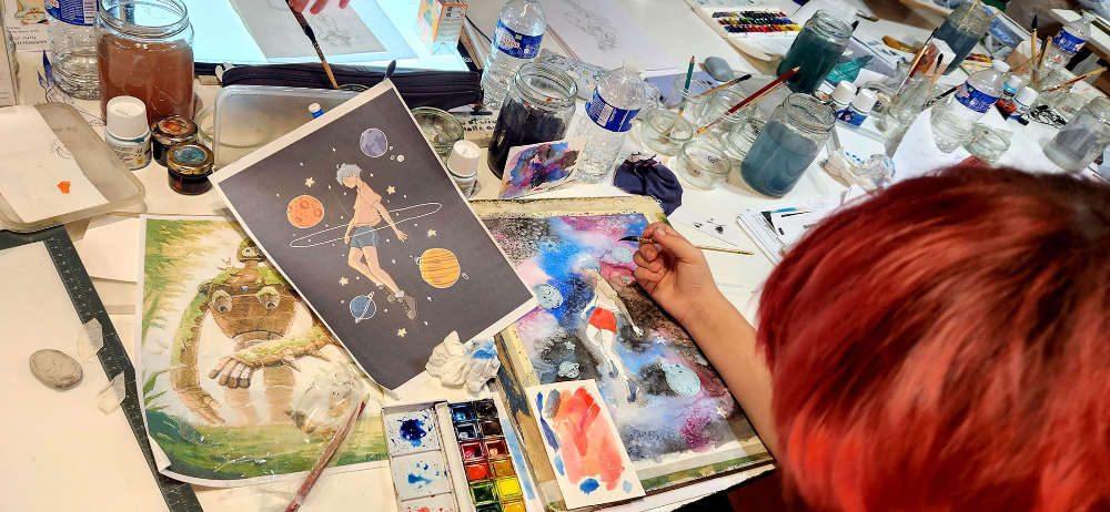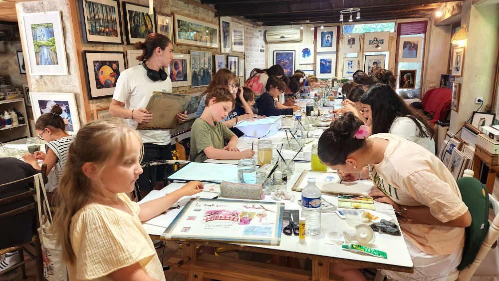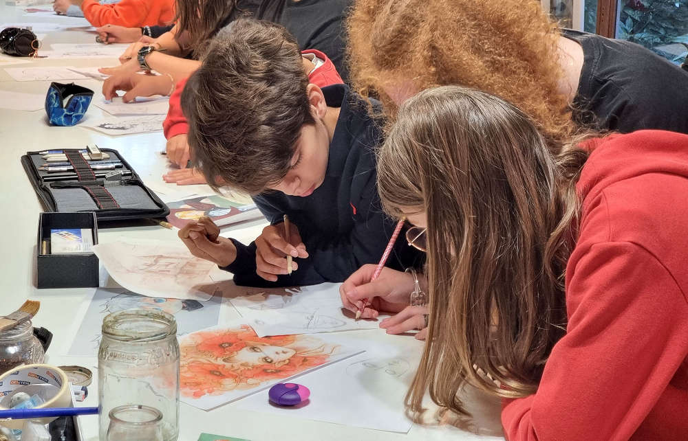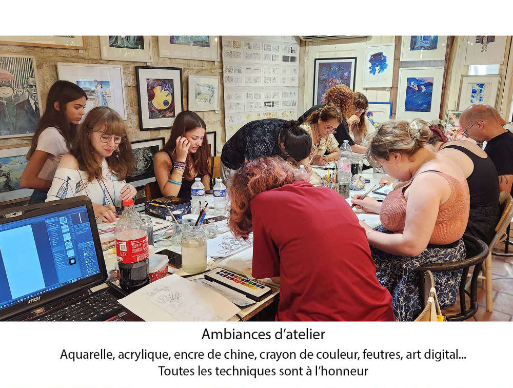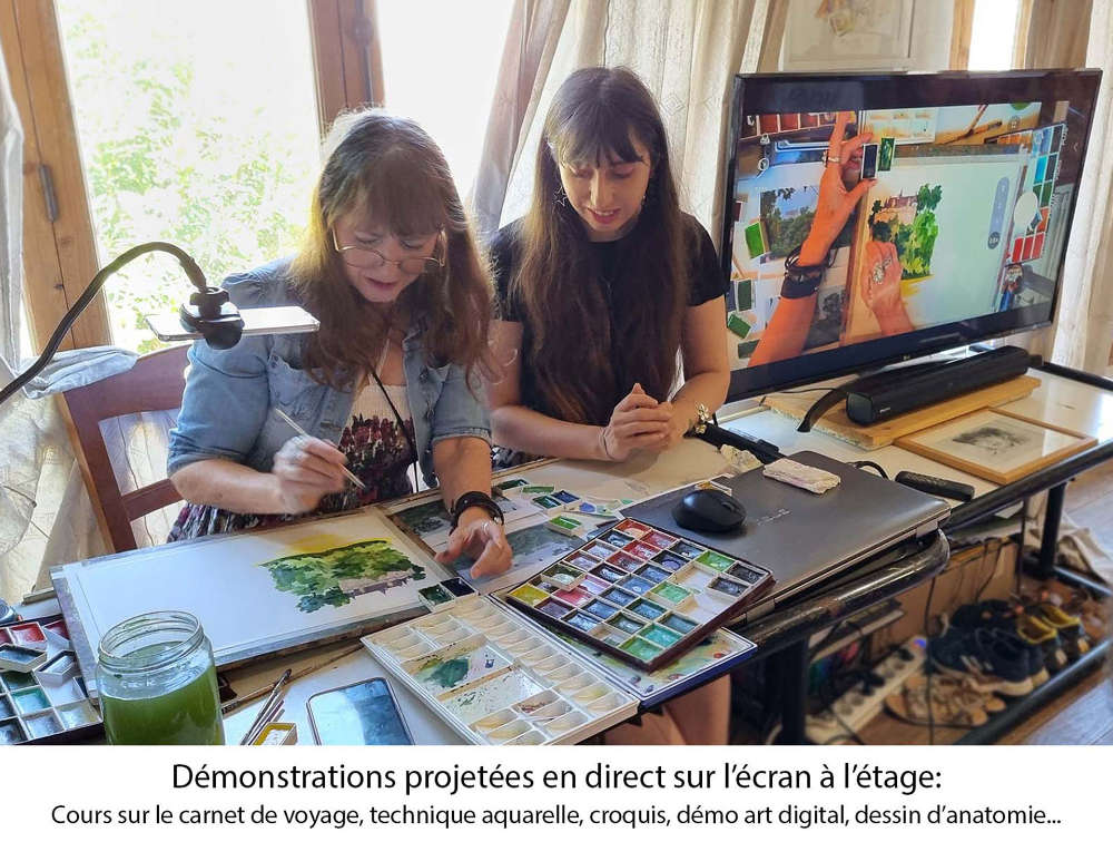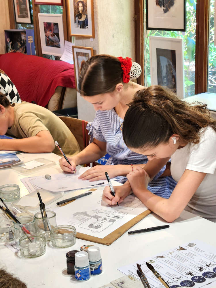 Au programme (un thème par jour, techniques variées : fusain, sanguine, brou de noix, encre de Chine, aquarelle, feutre, acrylique, collage…):