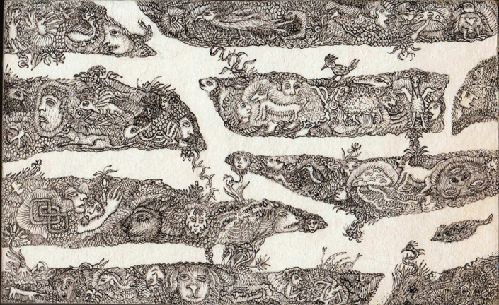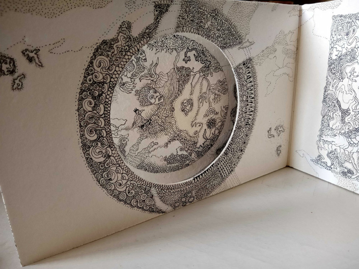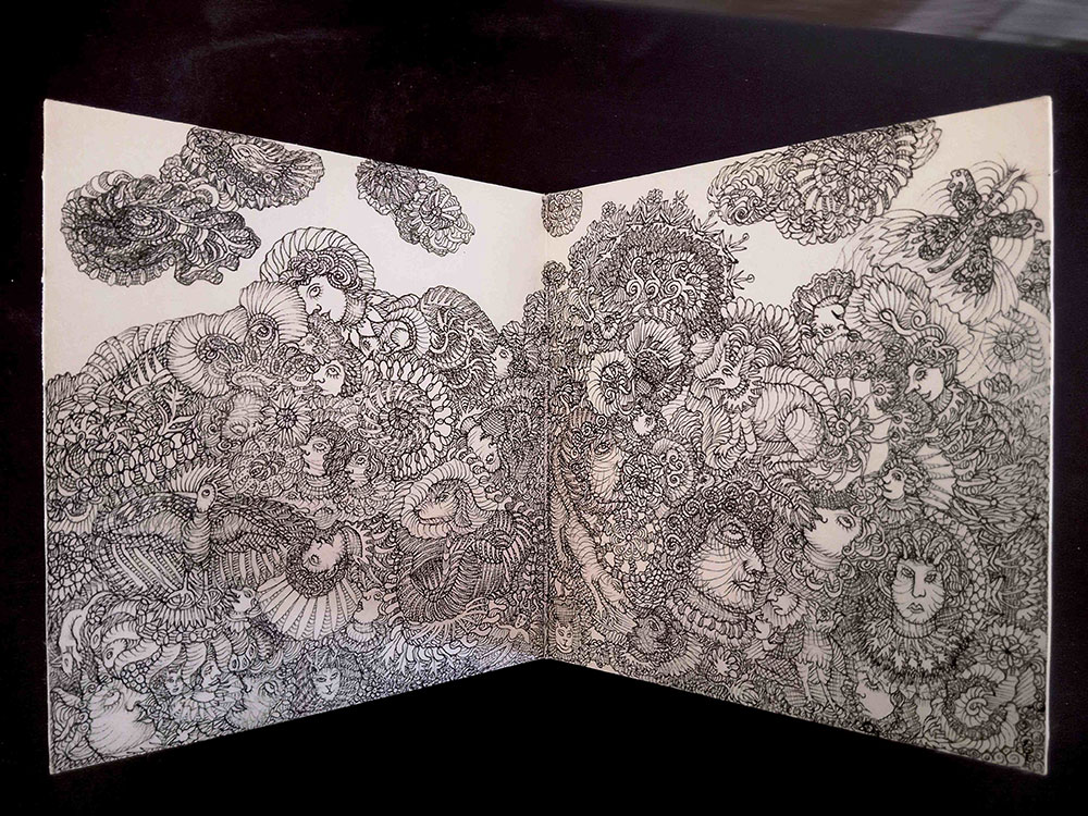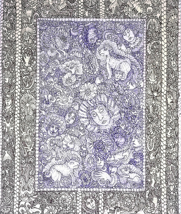 Ma démarche artistique a connu un tournant en 2023, lorsque je me suis mis à modifier des livres destinés au rebut pour pouvoir les utiliser dans un projet artistique. Mon dessin s’est inscrit dans ce nouveau cadre d’altération de livres, ce qui l’a amené à évoluer radicalement. Alors qu’il constituait une préparation à la pose de couleurs, il s’est transformé et a pris la forme de pratiques de griffonnage avec des stylos indélébiles. C’est un dessin fluctuant qui est caractérisé par son irréversibilité, à l’image de la vie. Il obéit à des règles différentes d’un dessin qui ne montre que son résultat final, parce qu’il rend visible la totalité d’un processus, aussi bien dans ses éventuelles errances ou impasses que dans ses aboutissements. Je me nourris du mouvement Cobra et de ses sources, art primitif, brut et enfantin, ainsi que des réflexions inspirantes d’Hundertwasser lorsqu’il suggère de peindre « presque comme un somnambule ».